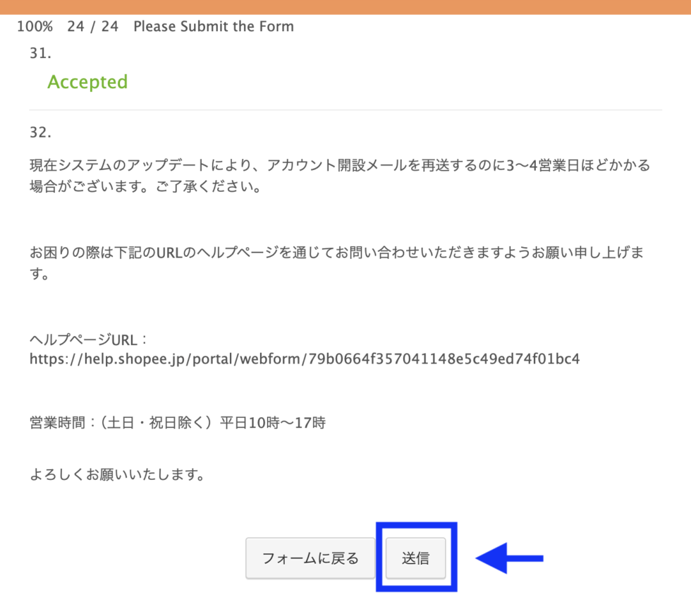 こちら(https://shopee.jp/account/)から、簡単な4つの必要情報を入力し、オレンジ色の送信ボタンをクリック。