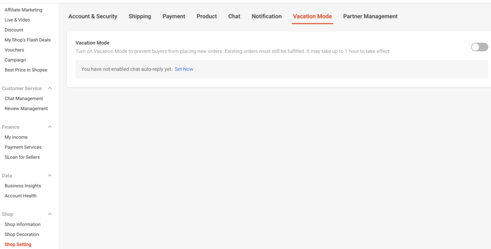 セラーセンターにログイン「Shop Settings」から「Vacation Mode」を選択
