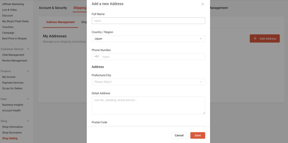 セラーセンターのメニューから「Shop Settings」→「Shipping」→「Address Management」をクリック「Add a new address」を選択